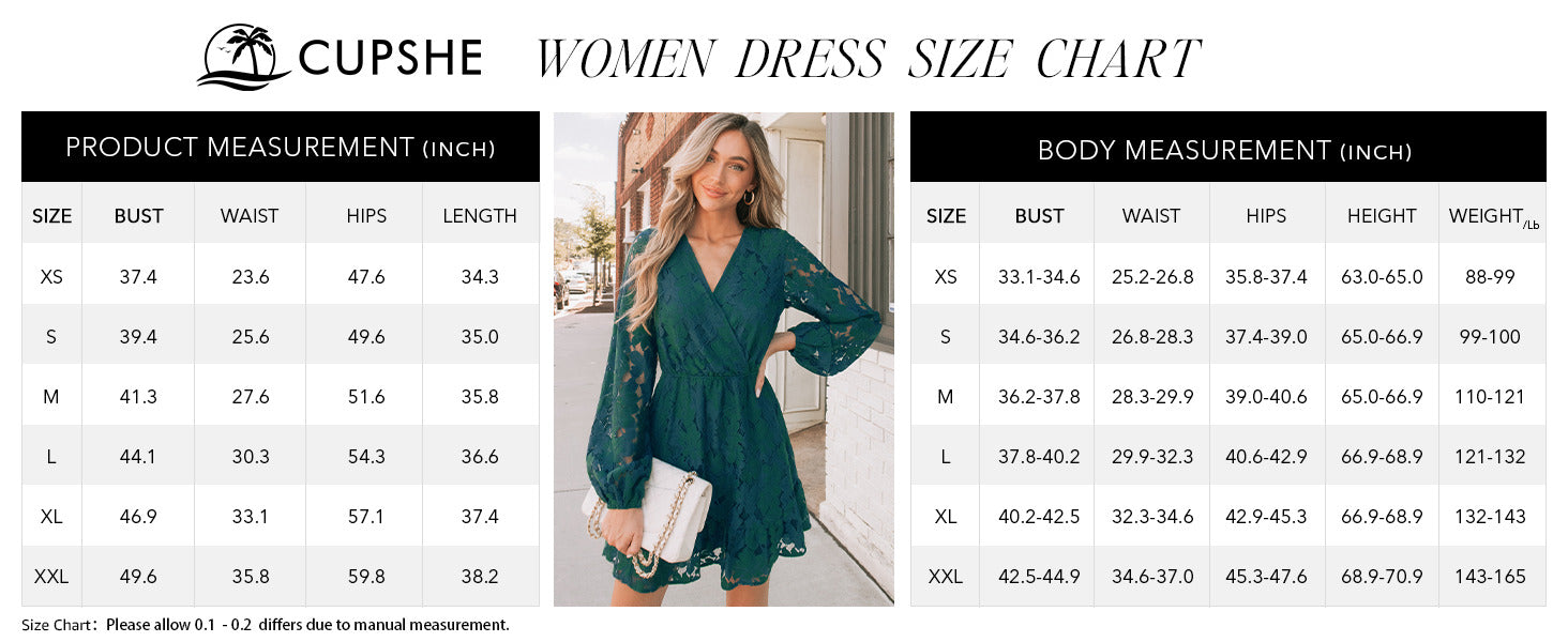 CUPSHE Women Elegant V Neck Lace Peasant Sleeves Summer Dress High Waist A Line Casual Spring Wedding Mini Dress