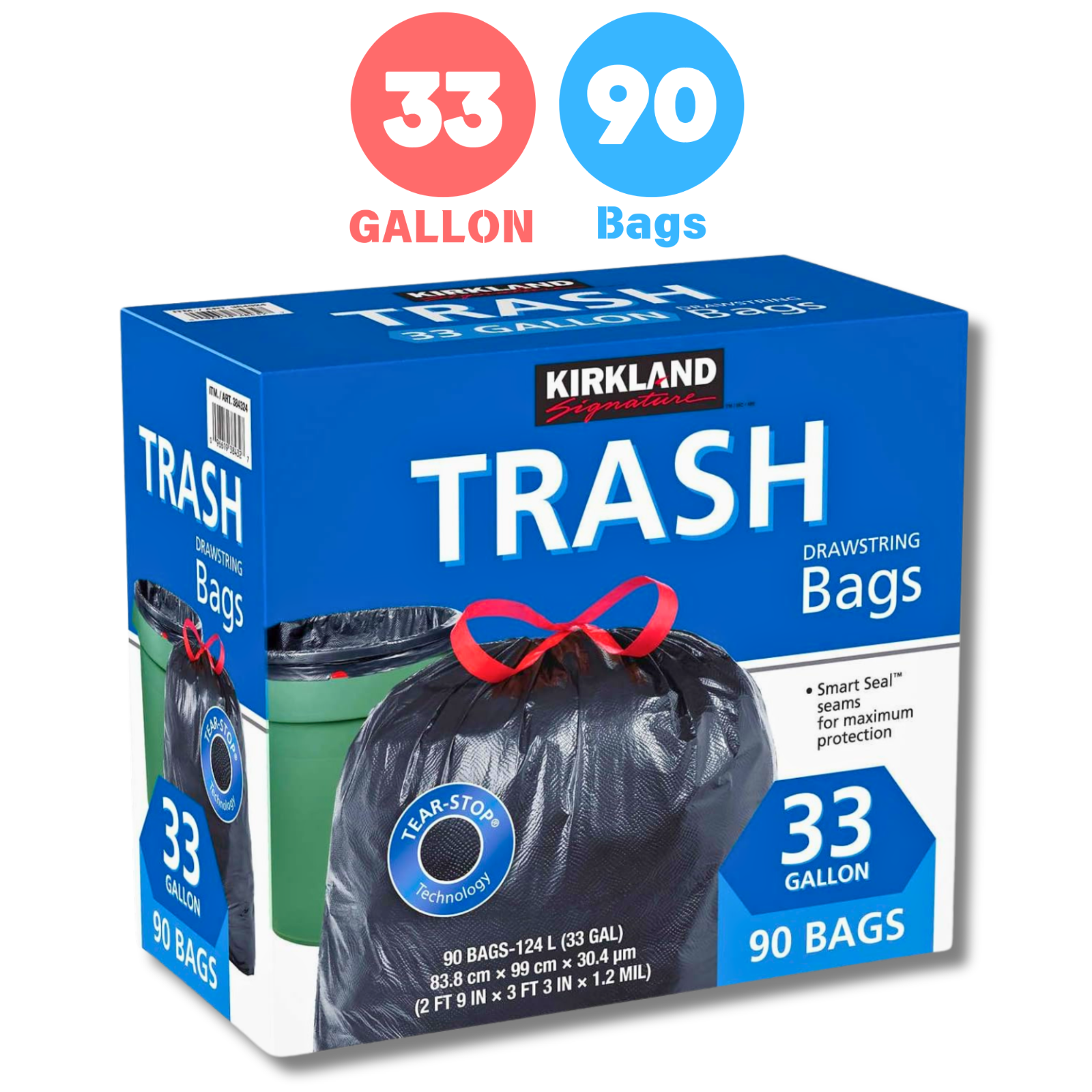 Kirkland Signature Flex-Tech 33-Gallon Trash Bags, 90-count offer a high-performance solution for managing large amounts of waste.