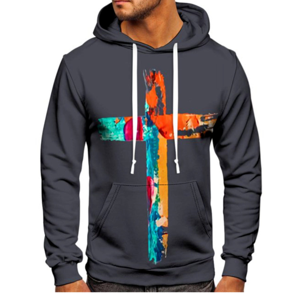 Men Graphic Design Cross Print Long Sleeve Hoodies Pocket Sweatshirt 3XL